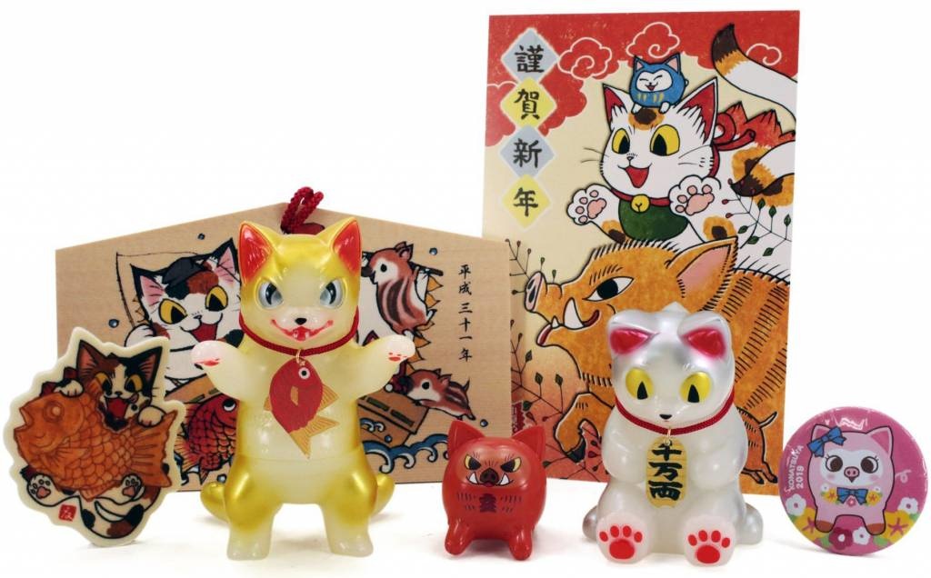 This year's Konatsuya Happy Bag contains the following items : - Negora Inuhariko Color - Shibara Manekineo Color - New Year Card - Can Badge - Felt Brooch - Sticker - Fortune Wooden Board Read more