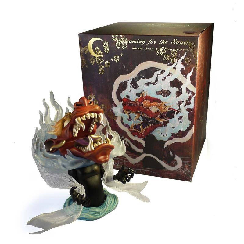 Based on Yoskay Yamamoto's original painting, Screaming for the Sunrise, Munky King is proud to present their original colorway of this beautiful figure. Featuring Red & Black accents and transparent flames, this piece also comes with a removable sheer ribbon and packaged in gold foil box.