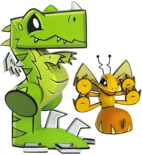 This terrific 2-figure set is the 3 Dimensional incarnation of the characters Wrecks and Dazey as is featured on the album, “My Dinosaur Life” from recording artists, Motion City Soundtrack. Wrecks is a lovable Tyrannosaurus Rex, and Dazey is his prehistoric oversized Bee pal!